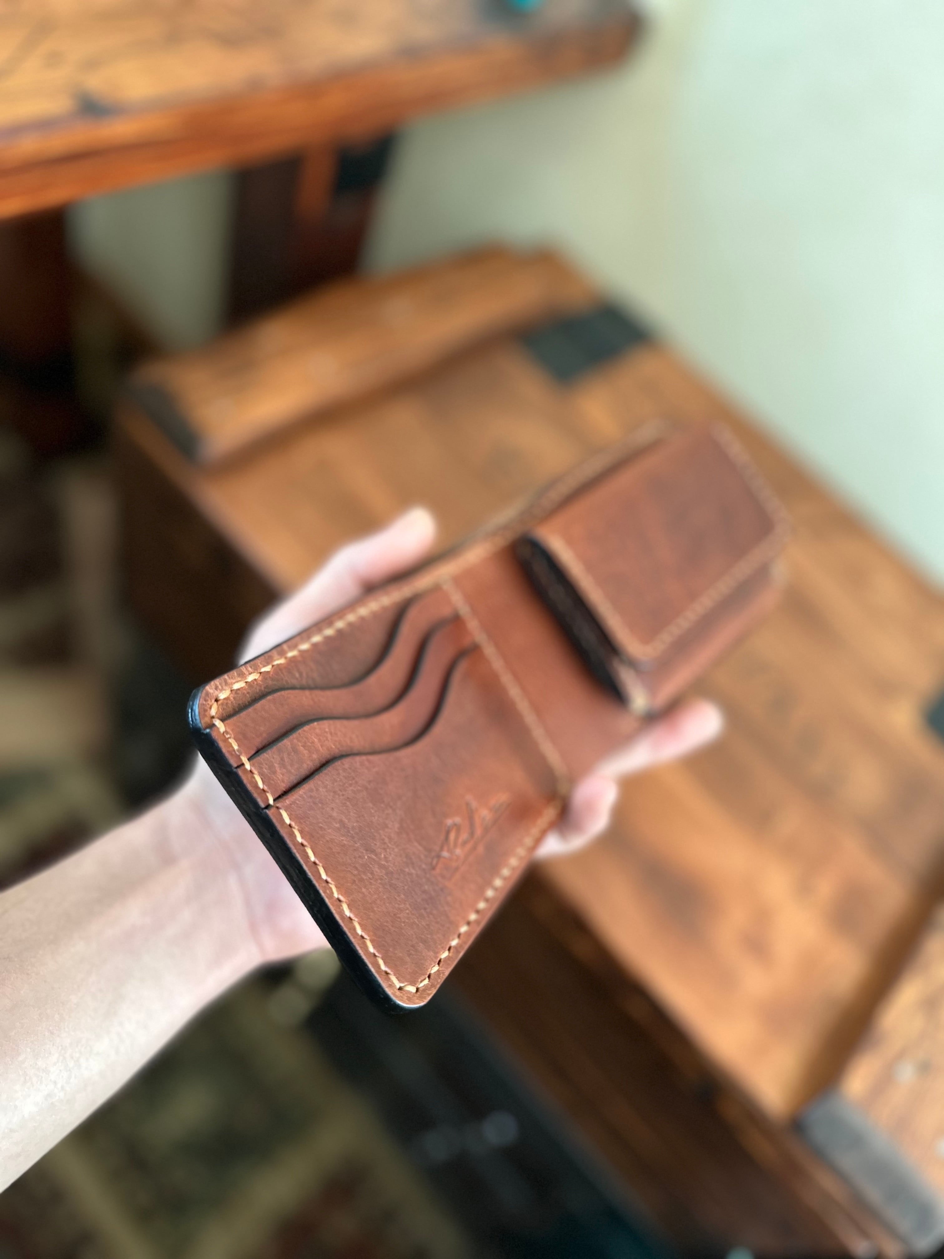 小銭入れには大きなマチをつけ視認性が良く、カードポケットは3つ取り付けています。シンプルでありながら機能性も重視したデザインです。